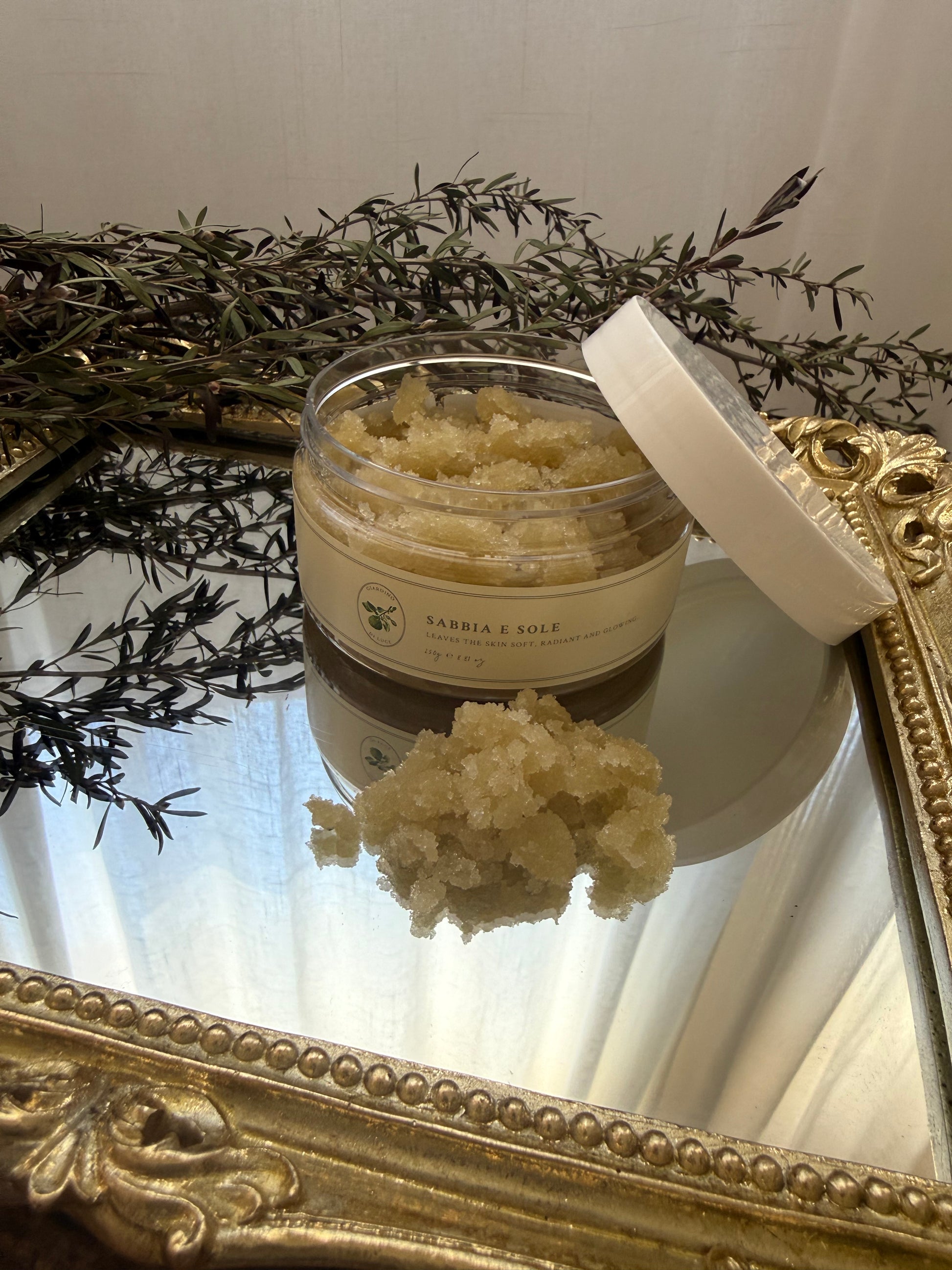 Sabbia e Sole is a certified organic sugar scrub crafted to gently exfoliate, renew, and revive the skin using pure, nutrient-rich botanicals. Inspired by sunlit Calabrian coastlines — warm sand (sabbia) and golden light (sole) — this scrub delivers smooth, glowing skin with every use.